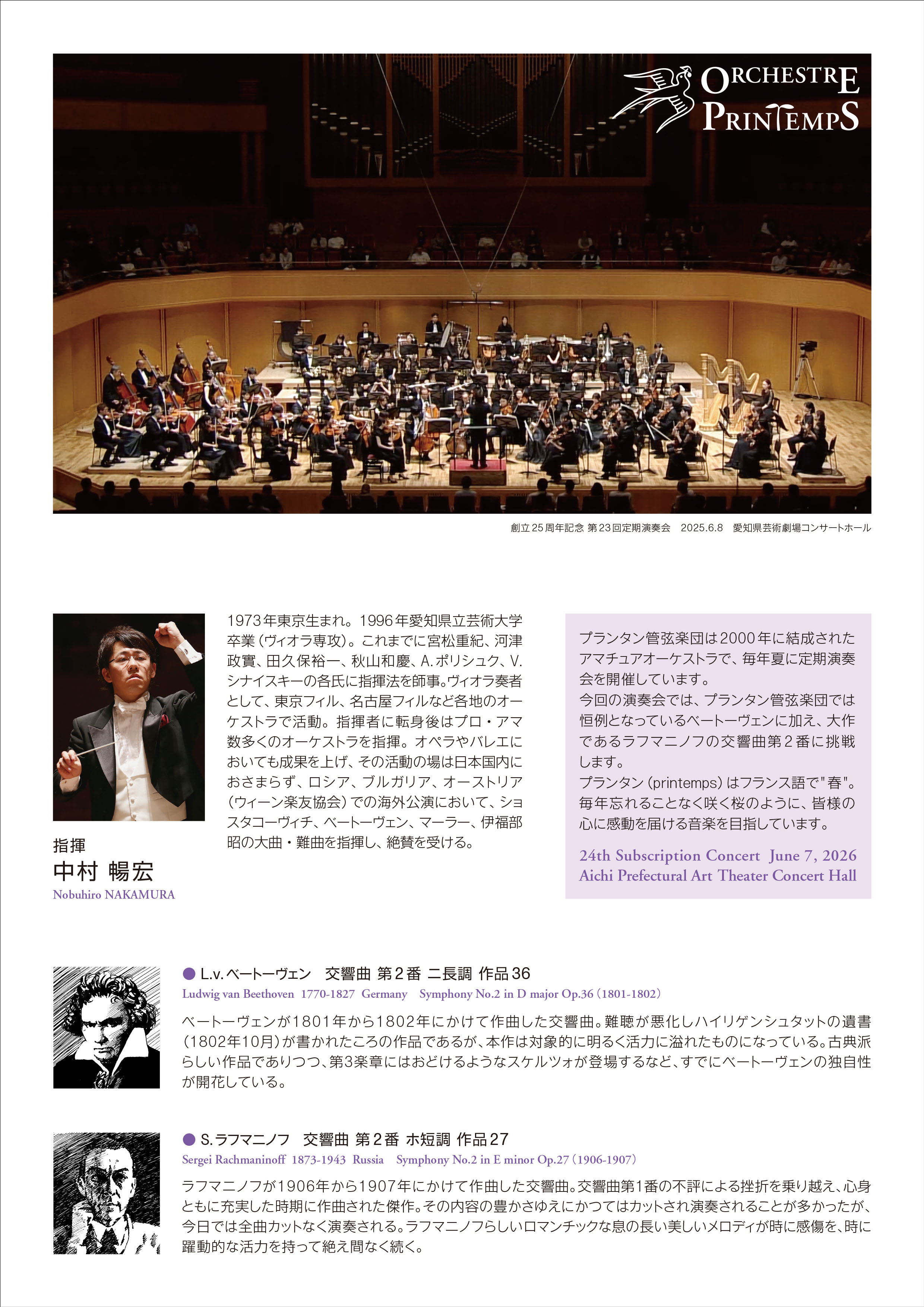 今回の演奏会では、プランタン管弦楽団では恒例となっているベートーヴェンに加え、大作であるラフマニノフの交響曲第2番に挑戦します。