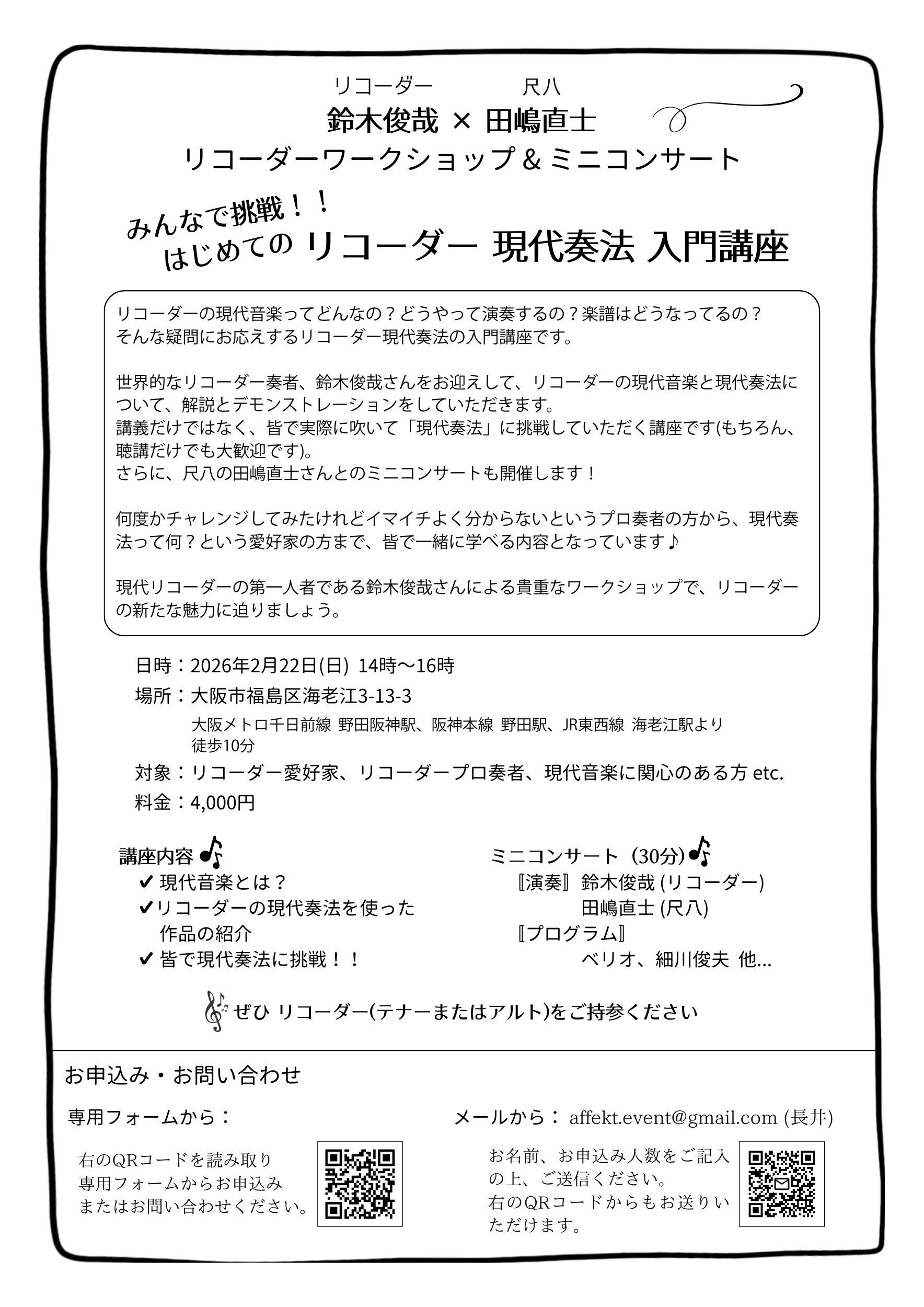 鈴木俊哉✕田嶋直士 リコーダー現代奏法ワークショップ & ミニコンサート