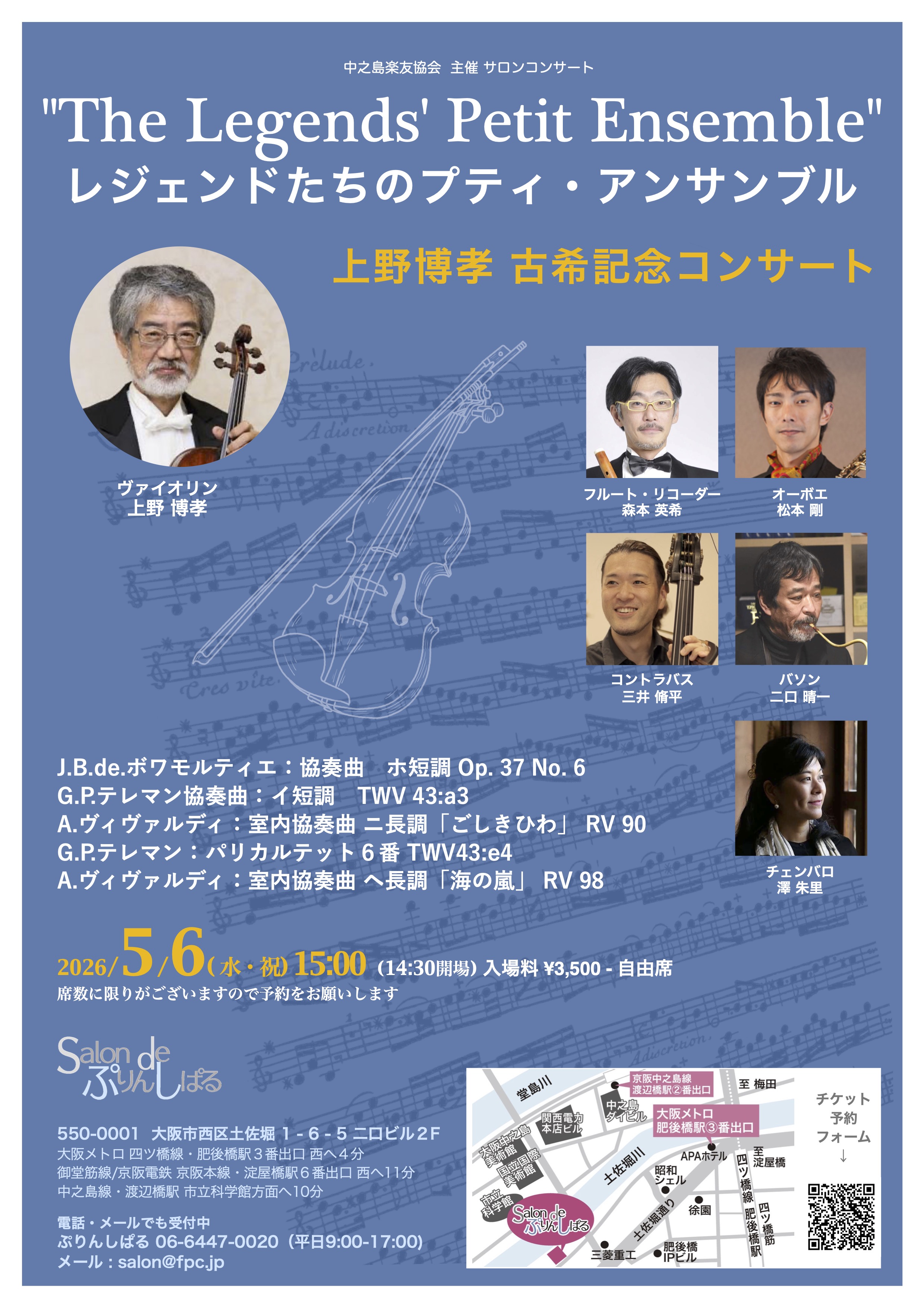 上野博孝氏(テレマン室内管弦楽団〜大阪フィルハーモニー交響楽団)の古希を祝うコンサートです。