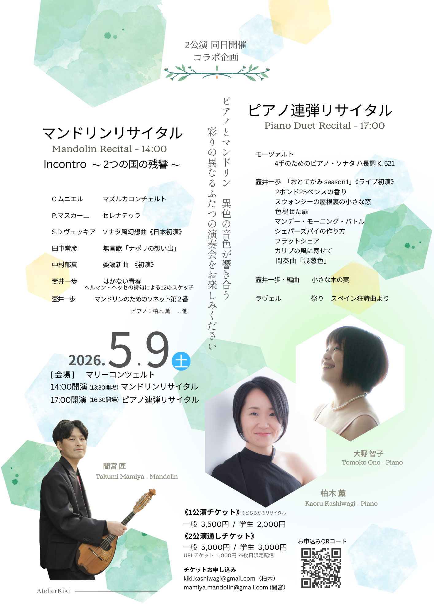 両リサイタルをお聴き頂けるよう通しチケットを用意しました。両方にちょこっと演出を加えたお楽しみの一日です。是非お越しくださいませ♪♪