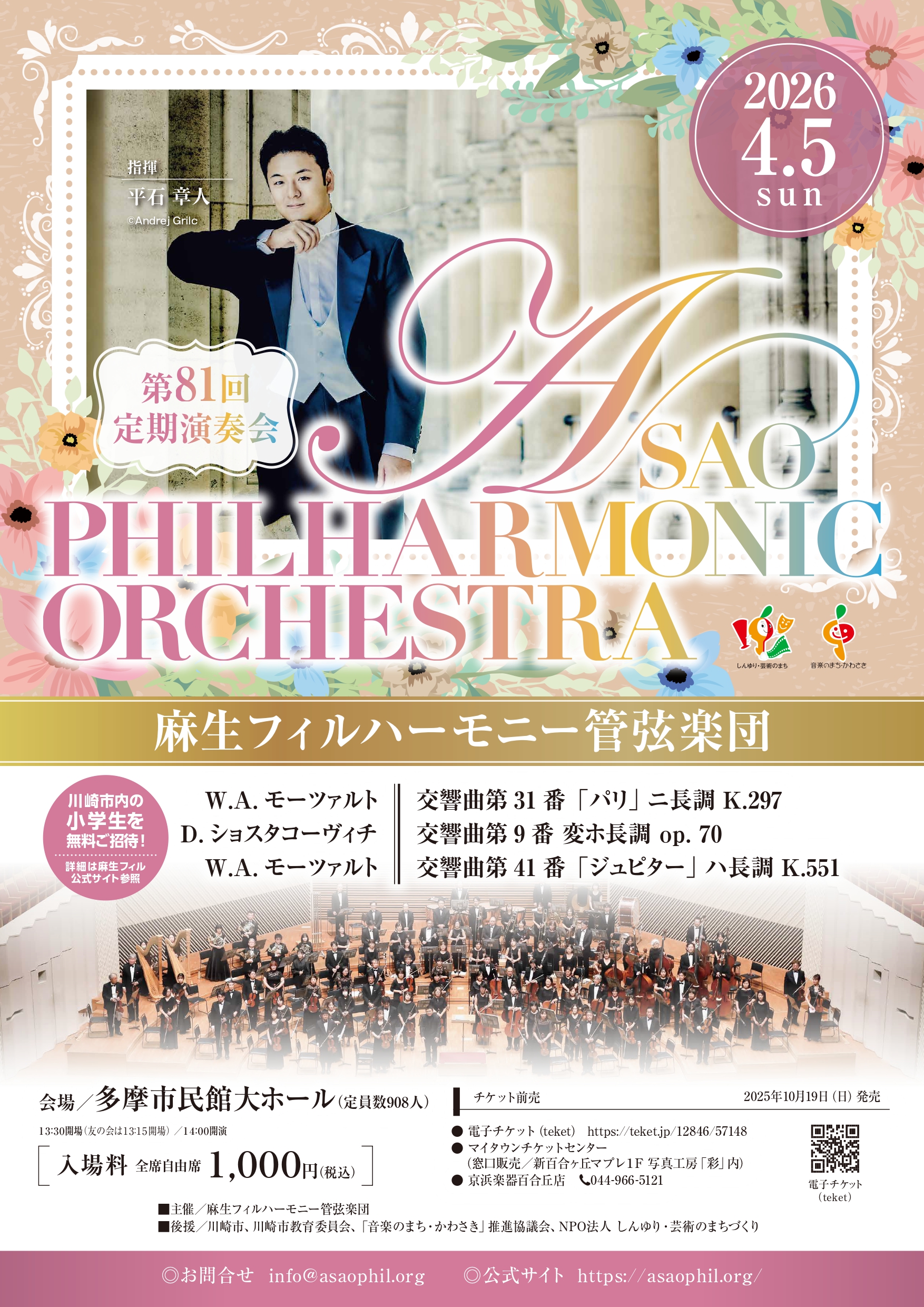 新しい生命の萌え出ずる春にふさわしい、軽やかな風が吹き抜けるような三曲をお届けします。麻生フィルでは久しぶりのモーツァルトの交響曲を二曲、パリ滞在中に書かれ当時のパリの流行りを取り入れた第31番「パリ」、最後の交響曲でありフーガ技法の素晴らしさ神々しさから「ジュピター」と呼ばれる第41番をお聴きいただきます。