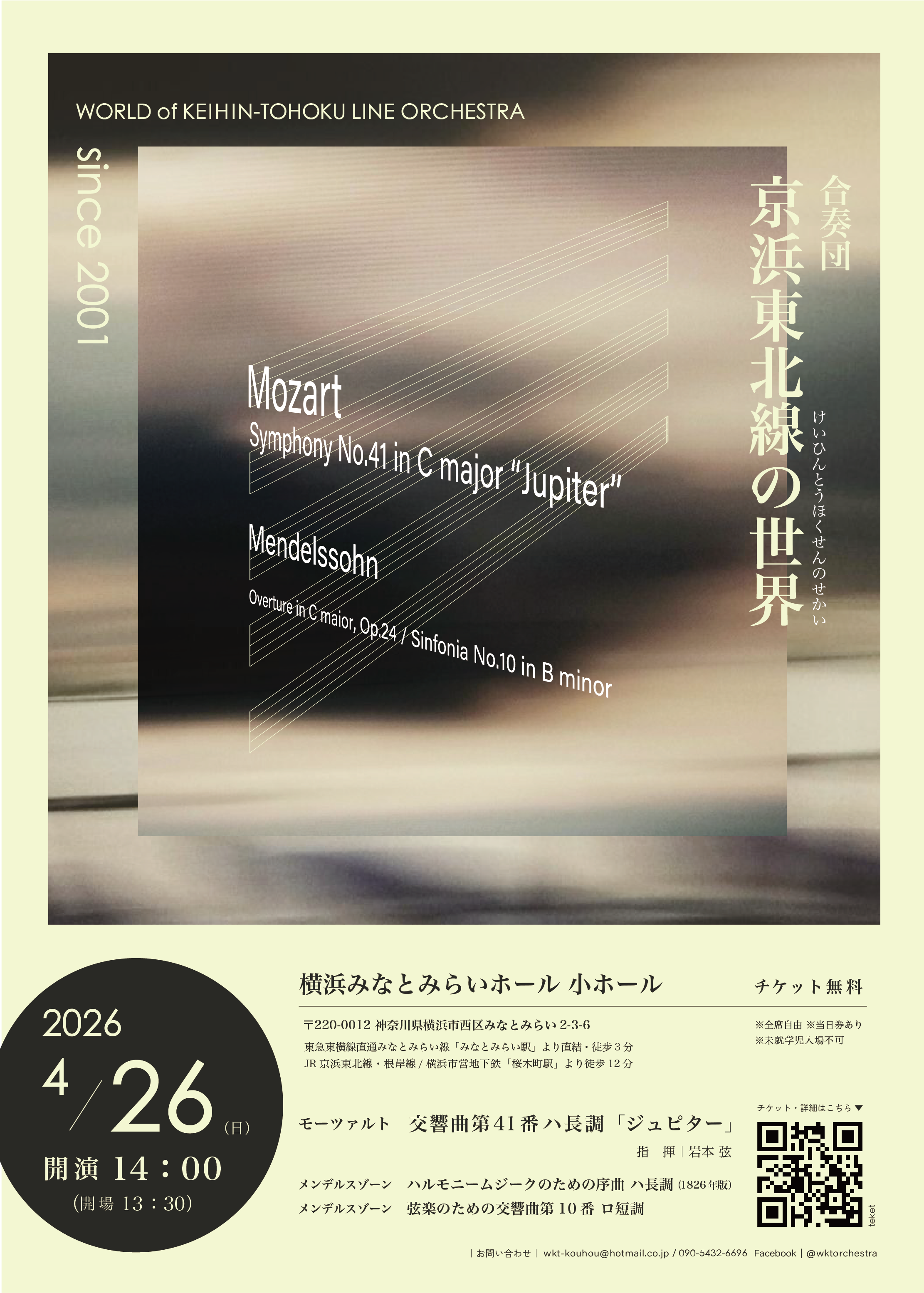 合奏団 “京浜東北線の世界”による2026年の演奏会が、横浜みなとみらいホールにて開催されます。本団体は2001年に慶應義塾ワグネル・ソサィエティー・オーケストラの有志により結成され、創立25周年を迎えた歴史あるアンサンブルです。指揮に岩本弦氏を迎え、メンデルスゾーンの若き才気溢れる「弦楽のための交響曲第10番」や、モーツァルト晩年の至高の傑作である交響曲第41番「ジュピター」をお届けいたします。歴代コンサートマスターをはじめとする熟練のメンバーが奏でる、情感豊かで緻密なアンサンブルの響きを、美しいホールの空間で存分にお楽しみいただけます。入場無料で本格的なクラシックの世界に触れられる貴重な機会をご堪能ください。