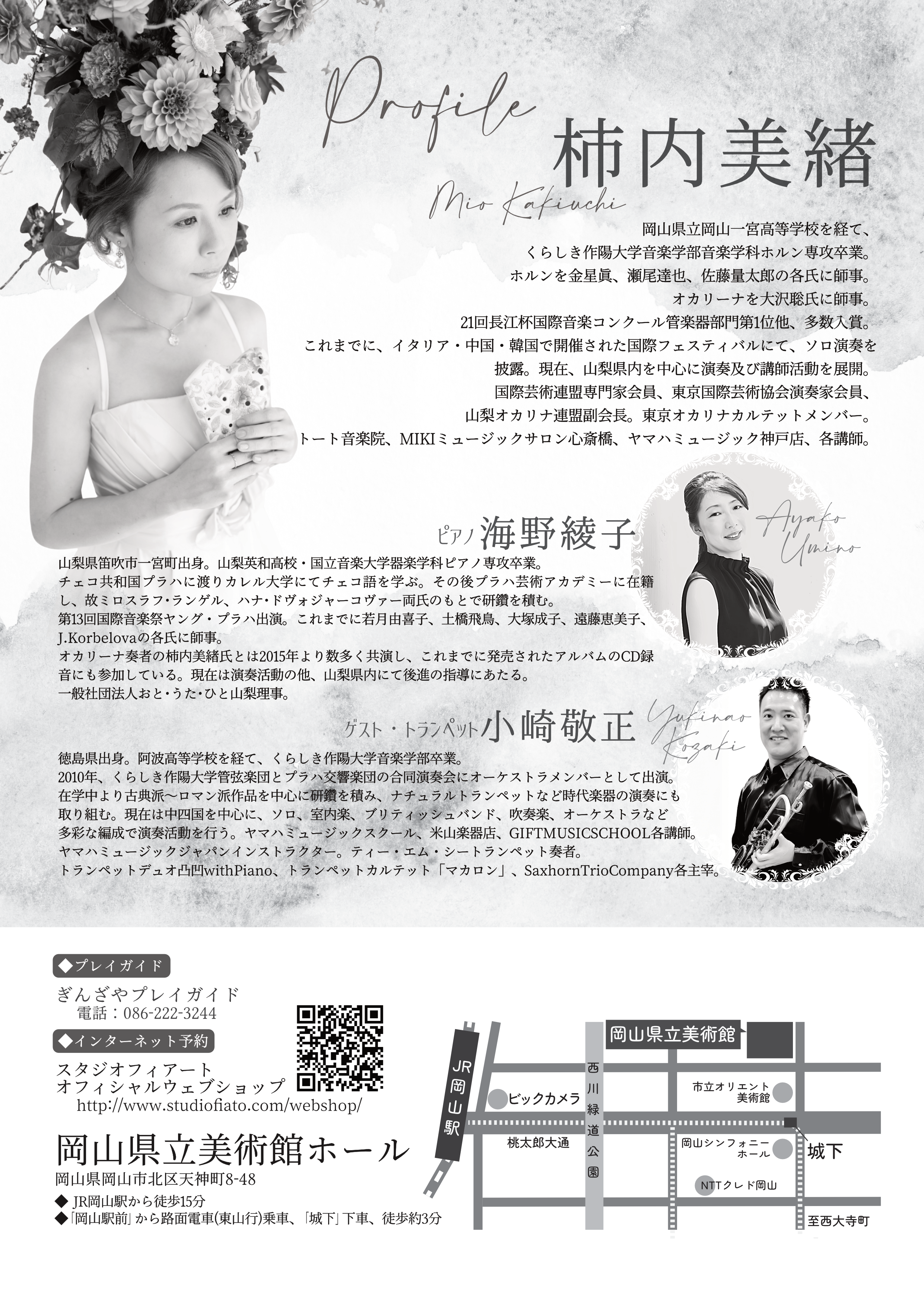 岡山県出身のオカリナ奏者・柿内美緒(山梨県在住)のリサイタル。ゲストは小崎敬正(トランペット)。
