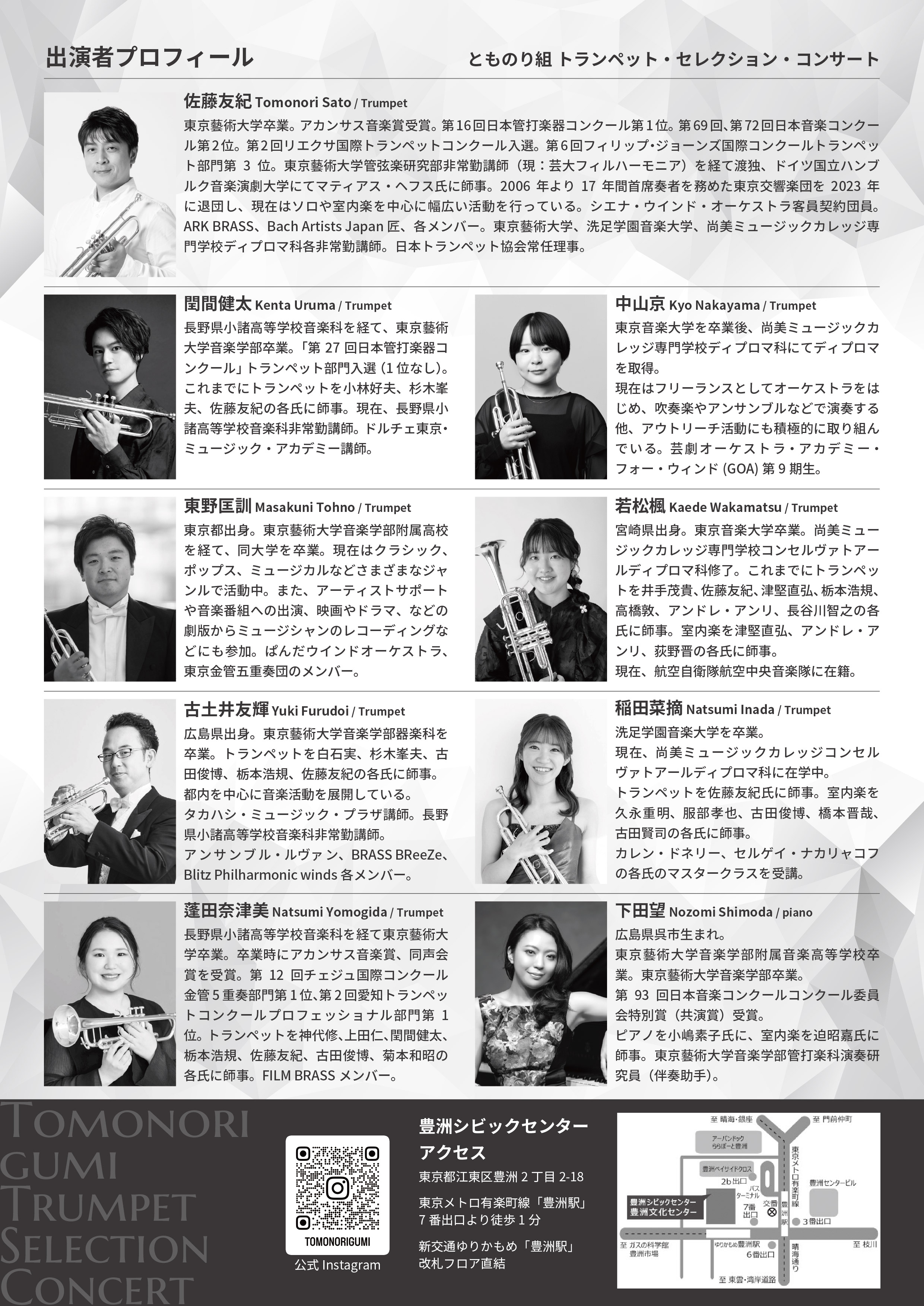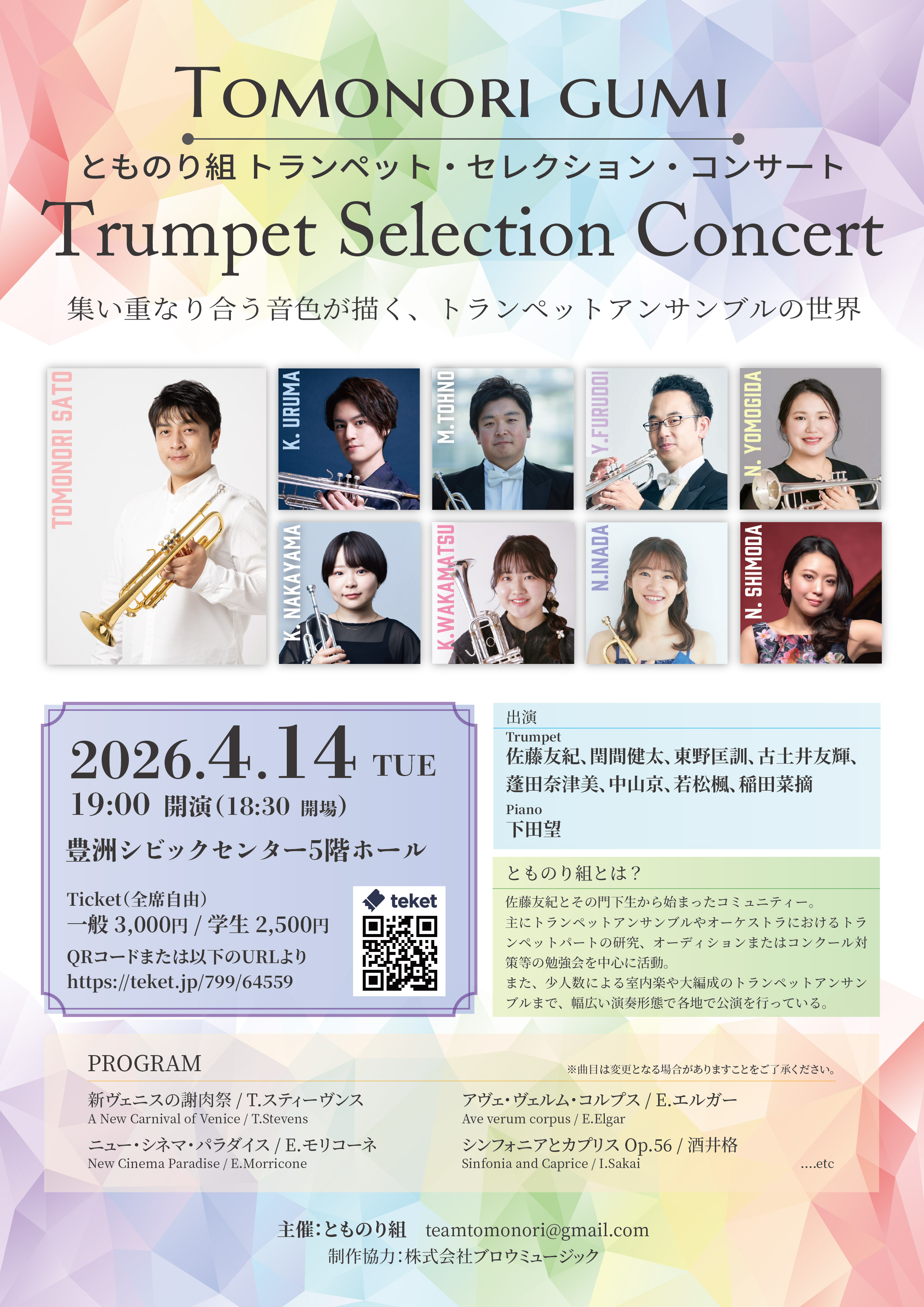 今回はピアニストの下田望さんをお迎えし、トランペットのみのアンサンブルの他に、ピアノも加わった作品もご用意しています。
