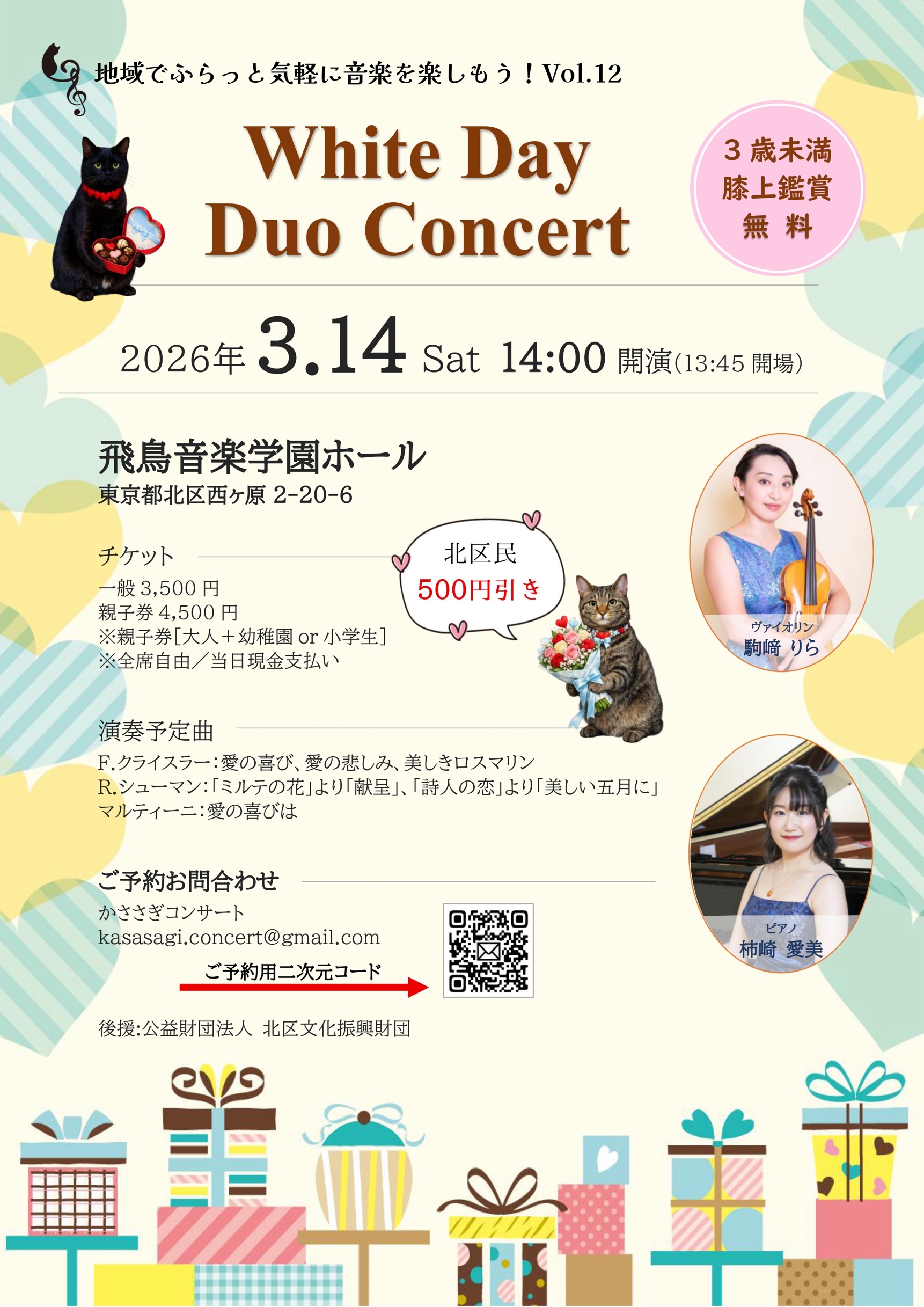 かささぎカルテットのメンバーである駒崎りら(ヴァイオリン)と柿崎愛美(ピアノ)が、ホワイトデーに贈る特別なデュオコンサートを東京都北区の飛鳥音楽学園ホールで開催いたします。