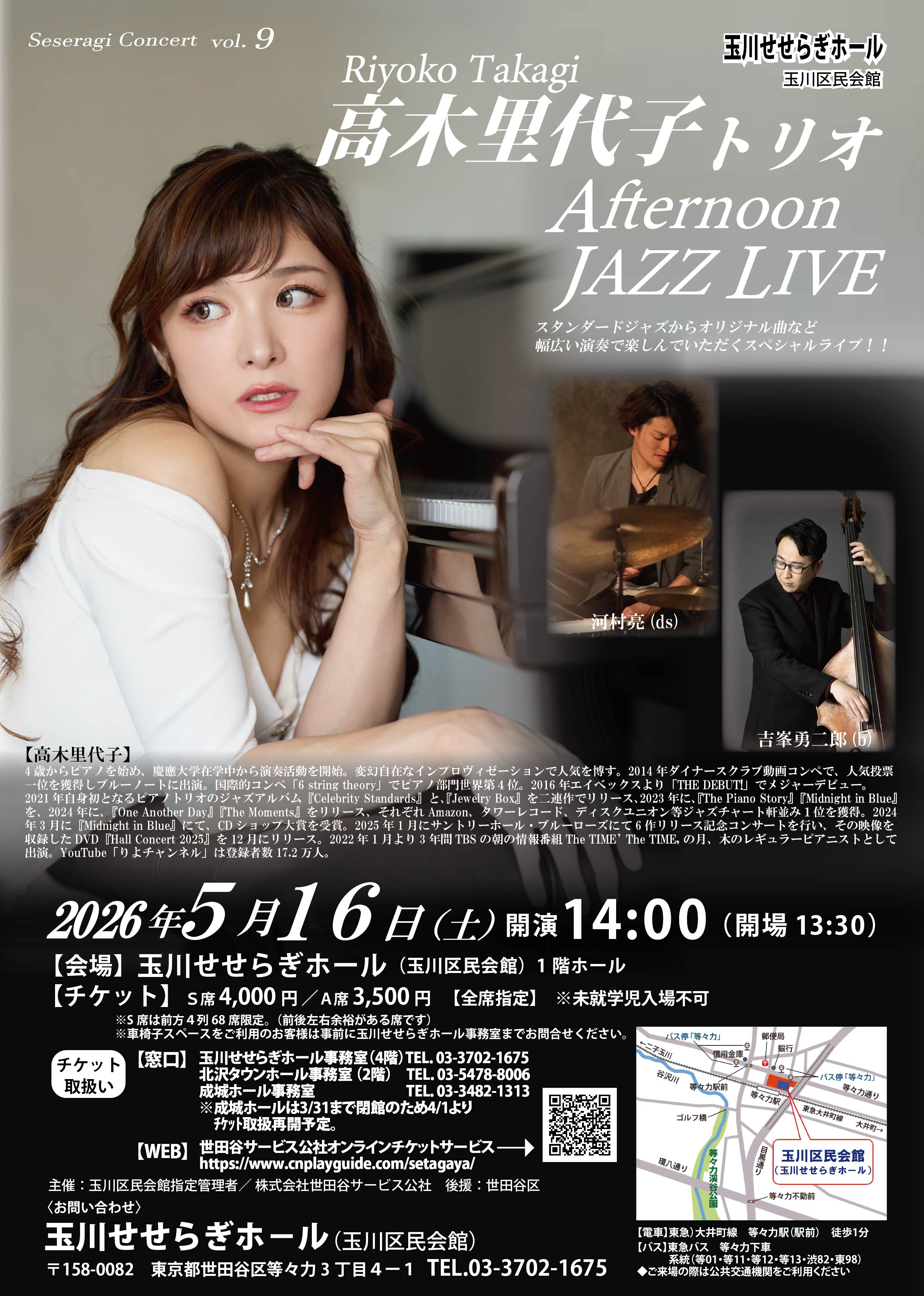 「せせらぎコンサートvol.9」として開催される本公演は、変幻自在なインプロヴィゼーションと圧倒的なテクニックで人気を博すピアニスト、高木里代子を中心としたトリオによる特別なステージです。共演に実力派ベーシストの吉峯勇二郎、ドラマーの河村亮を迎え、ジャズの醍醐味であるスタンダードナンバーから、独自の世界観が光るオリジナル曲まで、多彩なプログラムを披露します。玉川せせらぎホールの贅沢な空間で、瑞々しくも情熱的なジャズの生演奏を心ゆくまでお楽しみください。プロフェッショナルな三人が織りなす、その瞬間にしか生まれない音の対話と魅力溢れるパフォーマンスは、聴く人すべての心を掴んで離しません。