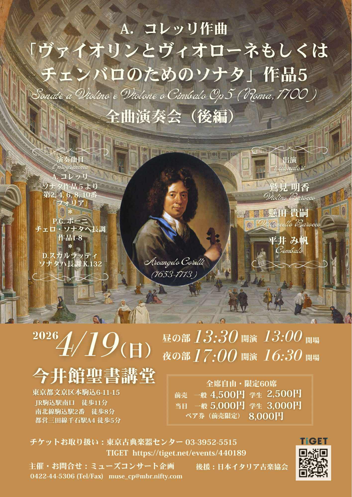 この度、満を持して、イタリア音楽に造詣の深い共演者お二人の心強いサポートのもと、これらの作品を是非まとめて皆様にお届けしたいと思い、全曲演奏会を企画しました。平井さん、懸田さんの演奏するローマの同時代人のチェンバロ、チェロそれぞれの独奏作品も必聴です。 鷲見明香