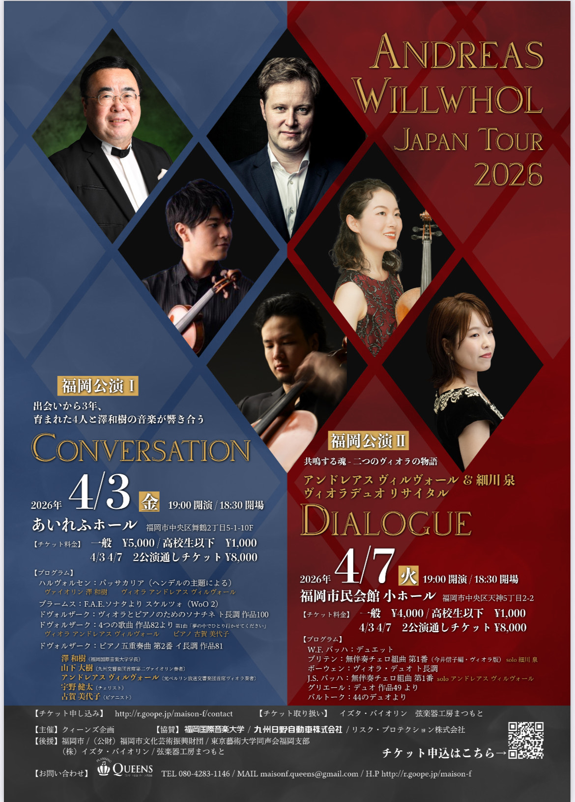 元ベルリン放送交響楽団首席ヴィオラ奏者アンドレアス•ヴィルヴォールと共演を重ねてきた元九州交響楽団首席ヴィオラ奏者細川泉によるデュオリサイタル。ソロ、デュオ共にヴィオラの魅力を存分にご堪能ください。