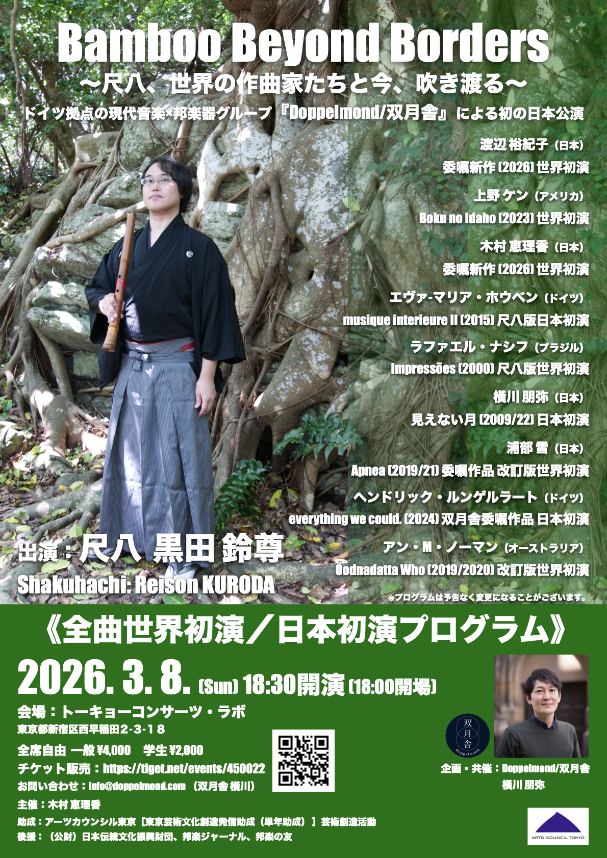 国際尺八コンクールでの優勝や文化庁文化交流使としての活動など、世界を舞台に活躍する尺八奏者・黒田鈴尊による独演会です。ドイツを拠点とする現代音楽と邦楽器のグループ『Doppelmond/双月舎』による初の日本公演として開催されます。全曲が世界初演または日本初演という、極めて希少かつ意欲的なプログラムです。日本のみならずブラジル、ドイツ、アメリカ、オーケストラなど世界各国の作曲家たちが描く尺八の新たな地平を、黒田鈴尊の卓越した技法と表現力によって鮮やかに描き出します。国境を越えた尺八の響きが、今、瑞々しく吹き渡ります。