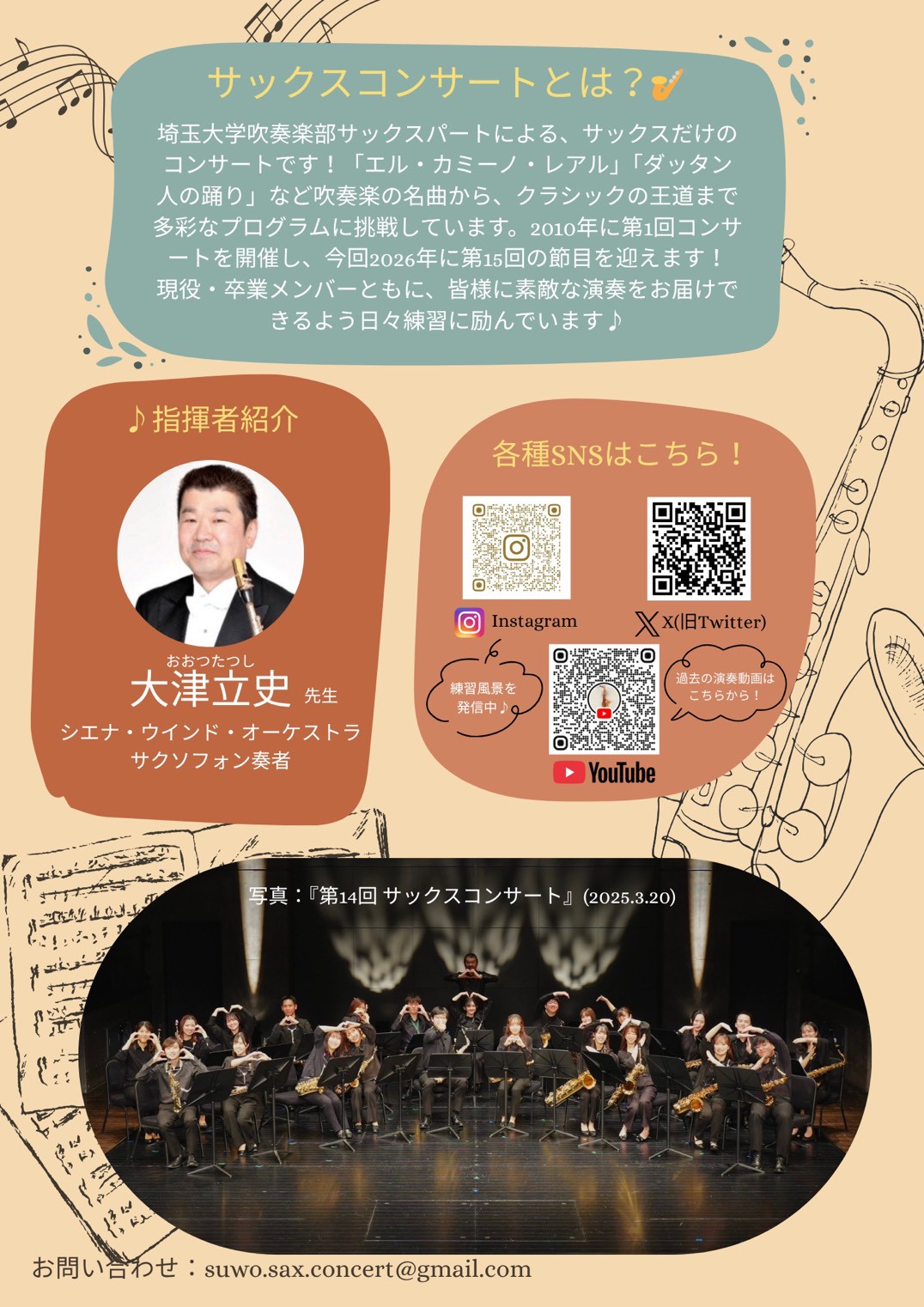 埼玉大学吹奏楽部サックスパートによる、サックスだけのコンサートです!!