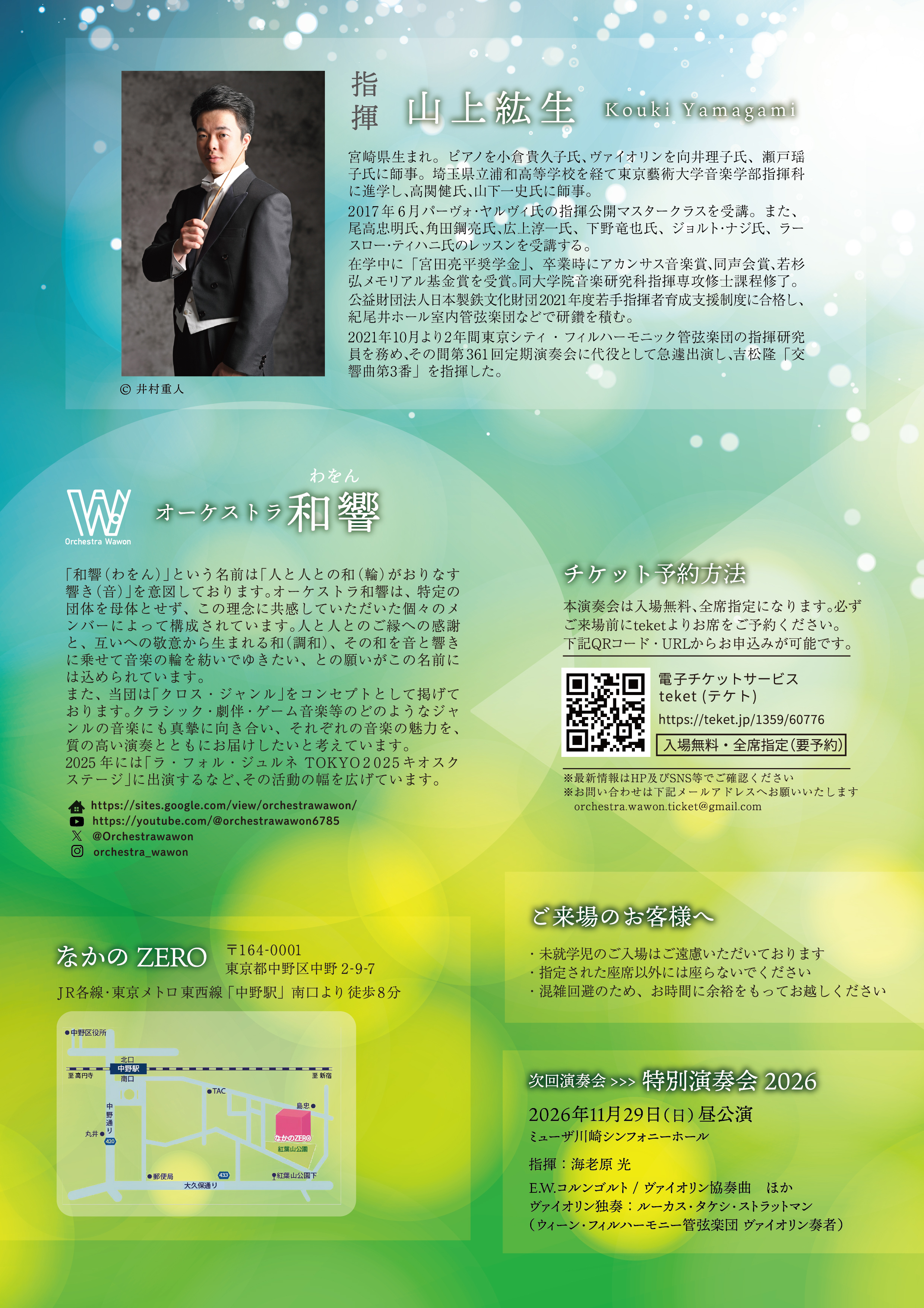 ・車椅子専用のスペースをご用意しております。ご利用希望のお客様は、主催者(orchestra.wawon@gmail.com)までご連絡ください。