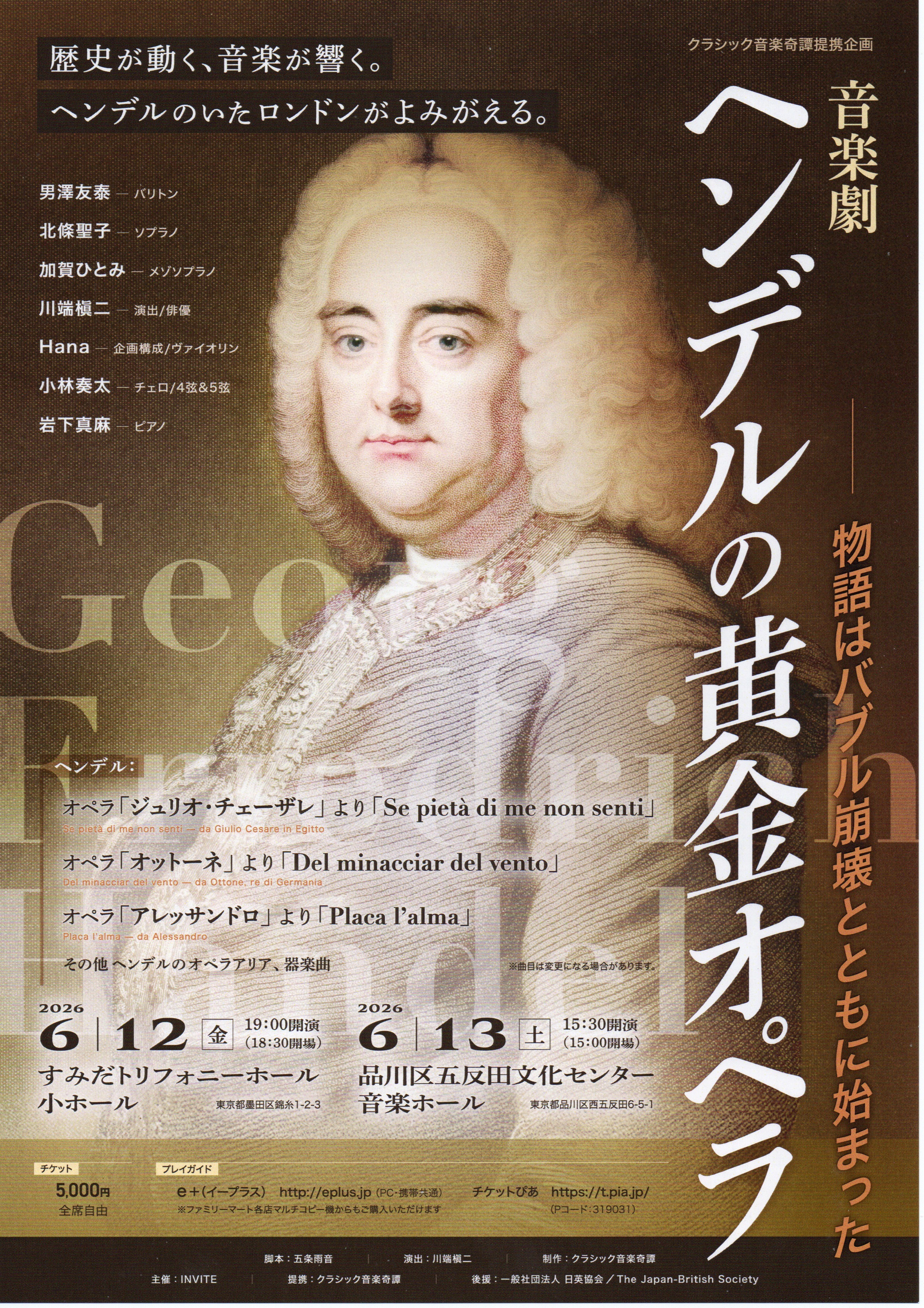 18世紀ロンドンの黄金期を築いた巨匠ゲオルク・フリードリヒ・ヘンデルの生涯と、当時の社会情勢を鮮やかに描き出す音楽劇です。