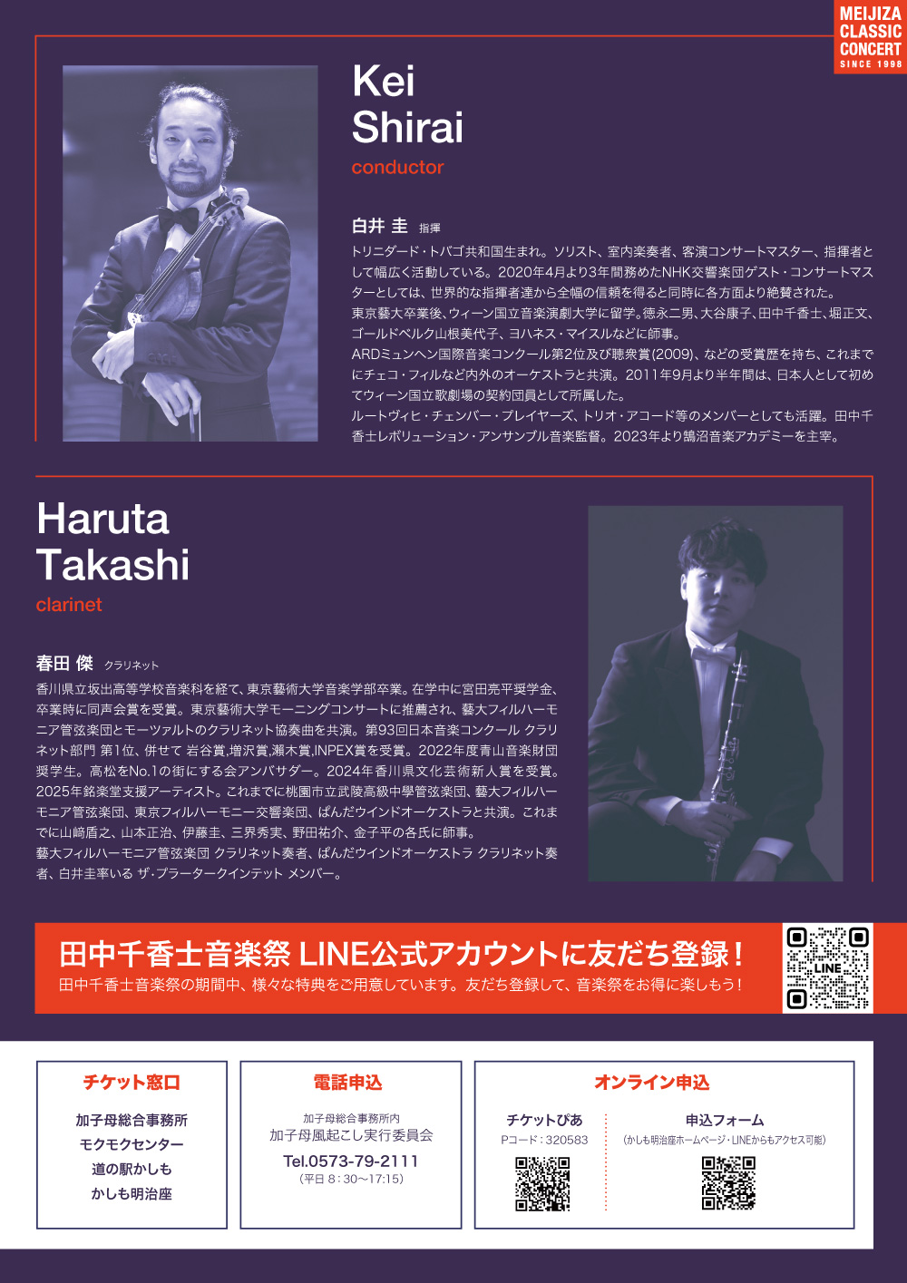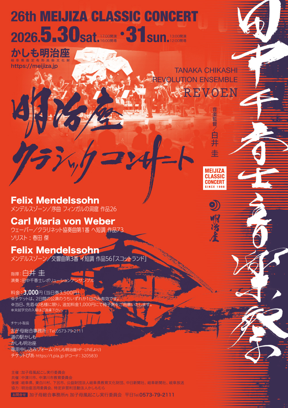 岐阜県中津川市にある歴史ある芝居小屋「かしも明治座」にて、Revolution Ensembleによる第26回クラシックコンサートが開催されます。白井圭氏の指揮のもと、メンデルスゾーンがスコットランドを旅して得た風景と情感が色濃く反映された名作、序曲「フィンガルの洞窟」と交響曲第3番「スコットランド」を演奏いたします。さらに、ソリストとして春田傑氏を迎え、ウェーバーのクラリネット協奏曲第1番をお届けします。畳の上でゆったりとくつろぎながら、明治座の空間でしか生まれない特別な響きと名曲の数々を存分に堪能できる、贅沢なひとときをお楽しみください。