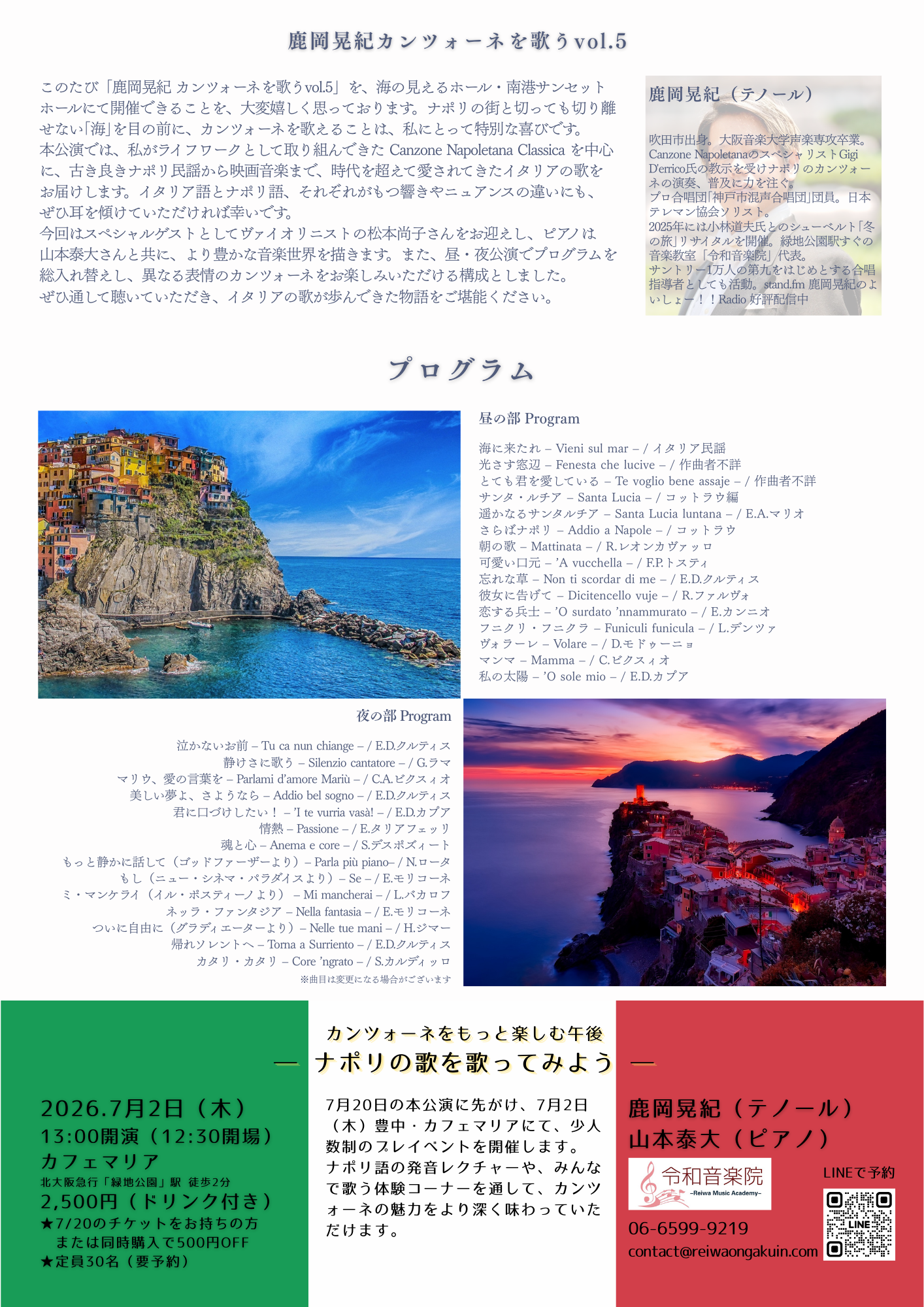 各公演でプログラムを総入れ替えし、異なる表情のカンツォーネをお楽しみいただける構成となっています。