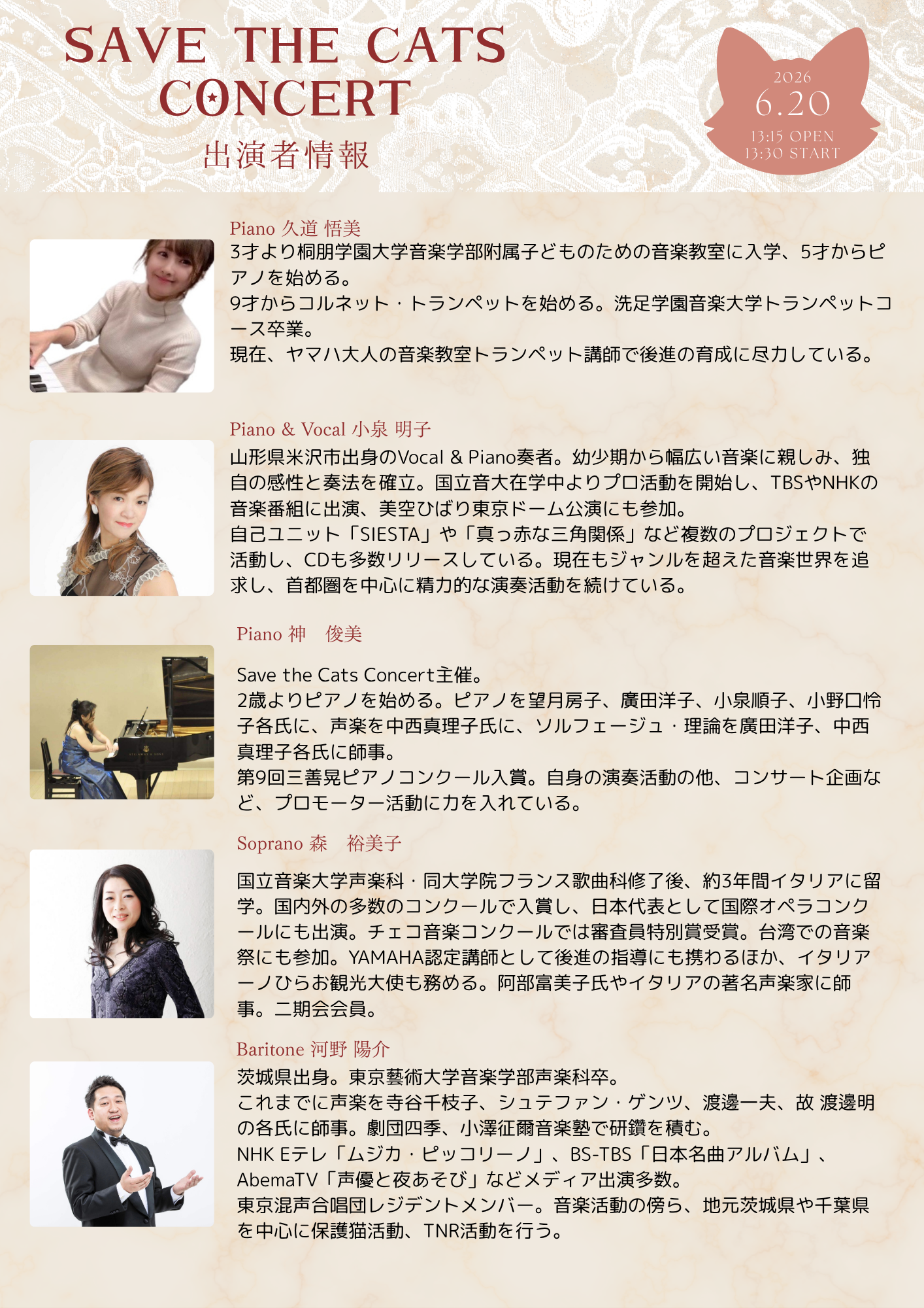 「すべての猫を幸せにしたい」という願いから企画された、Save The Cats Concertによるチャリティ演奏会です。
