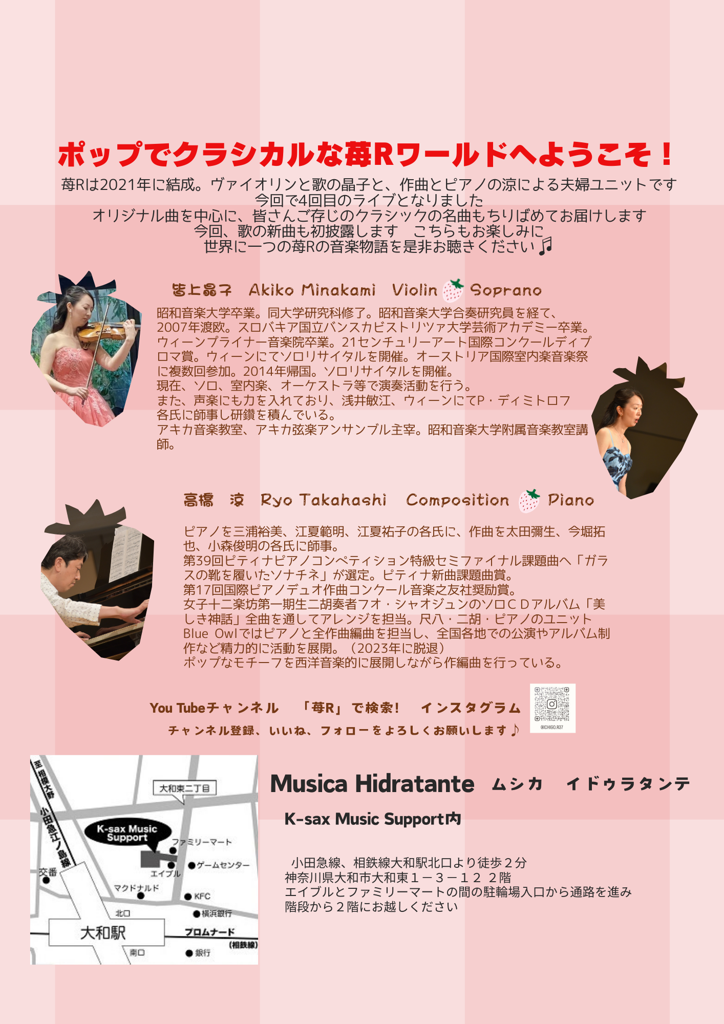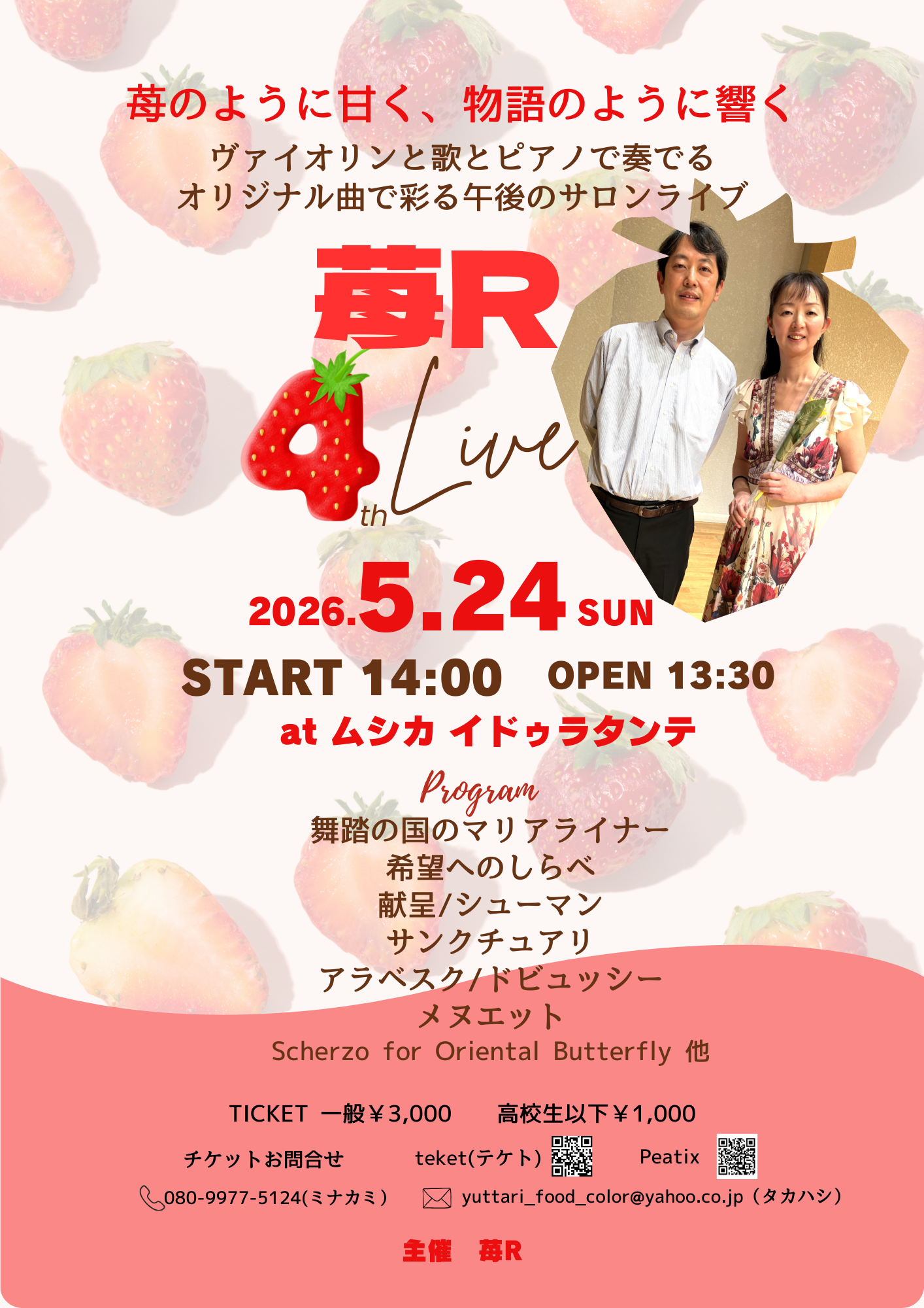 今回もソプラノ/ヴァイオリンの皆上晶子と、作曲/ピアノの高橋涼の二人だけで、オリジナル曲を中心にポップでクラシカルな苺Rワールドをお届けしますので、ぜひ聴いていただけたら嬉しいです。