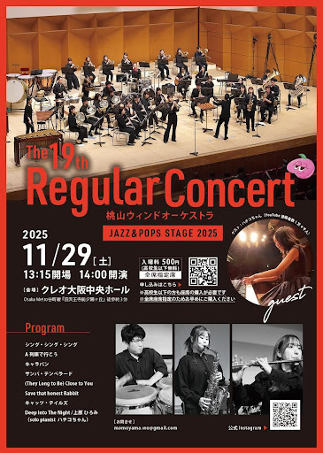 桃山ウィンドオーケストラの第19回定期演奏会は、「JAZZ & POPS STAGE 2025」と題し、ジャズやポップスに彩られたプログラムをお届けします。 第1部はスタンダードなジャズナンバーやラテンリズムが躍動します。 第2部では上原ひろみ作曲の難曲「Deep into the night」に挑戦。ゲストの高校1年生ピアニスト・ハチコちゃんによる超絶技巧ソロも必聴です。 ピーター・グレイアム作曲「キャッツ・テイルズ」ではニューヨークのジャズシーンへのオマージュを感じられ、楽しく聴き応えあるステージをお楽しみいただけます。